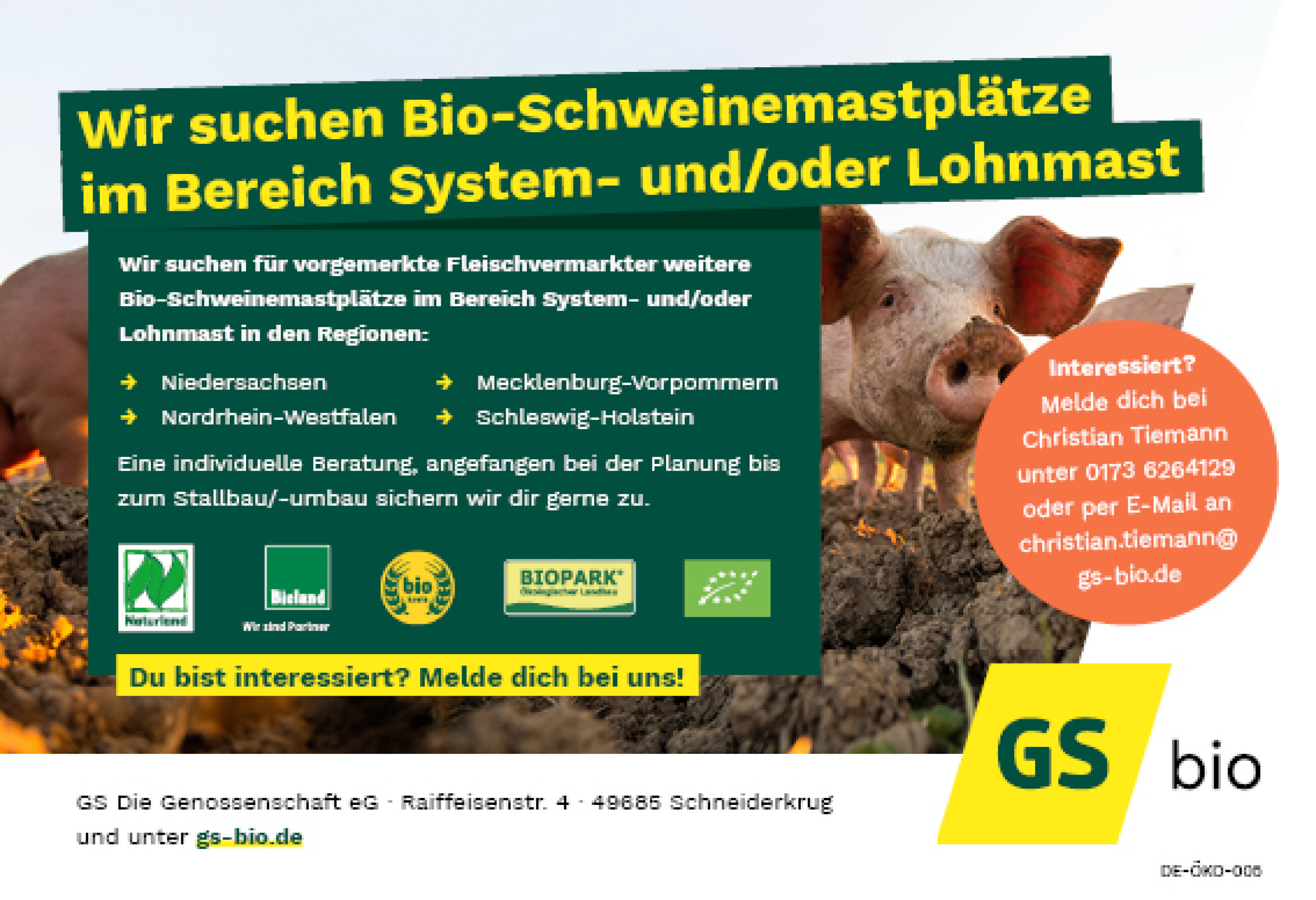 Wir suchen für vorgemerkte Fleischvermarkter weitere Bio-Schweinemastplätze im Bereich System- und/oder Lohnmast in den Regionen Niedersachsen, Mecklenburg-Vorpommern, Nordrhein-Westfalen und Schleswig-Holstein.